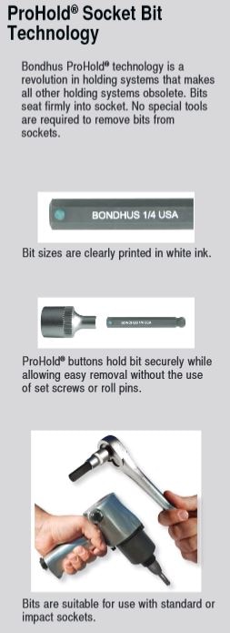 Bondhus hex end socket bits fit any standard 6-point socket and are suitable for use with impact sockets. Chamfered tool tips eliminate burrs and help tools seat in screw head. The sharp corners transfer more torque to the screw and reduce stripping. Bits can be purchased with or without sockets. ProHold technology holds bits securely but remains easy to remove without the use of special tools. Every Bondhus tool is designed and machined to achieve an optimal fit between tool and fastener. Bondhus professional quality tools provide superior value and offer a lifetime warranty.