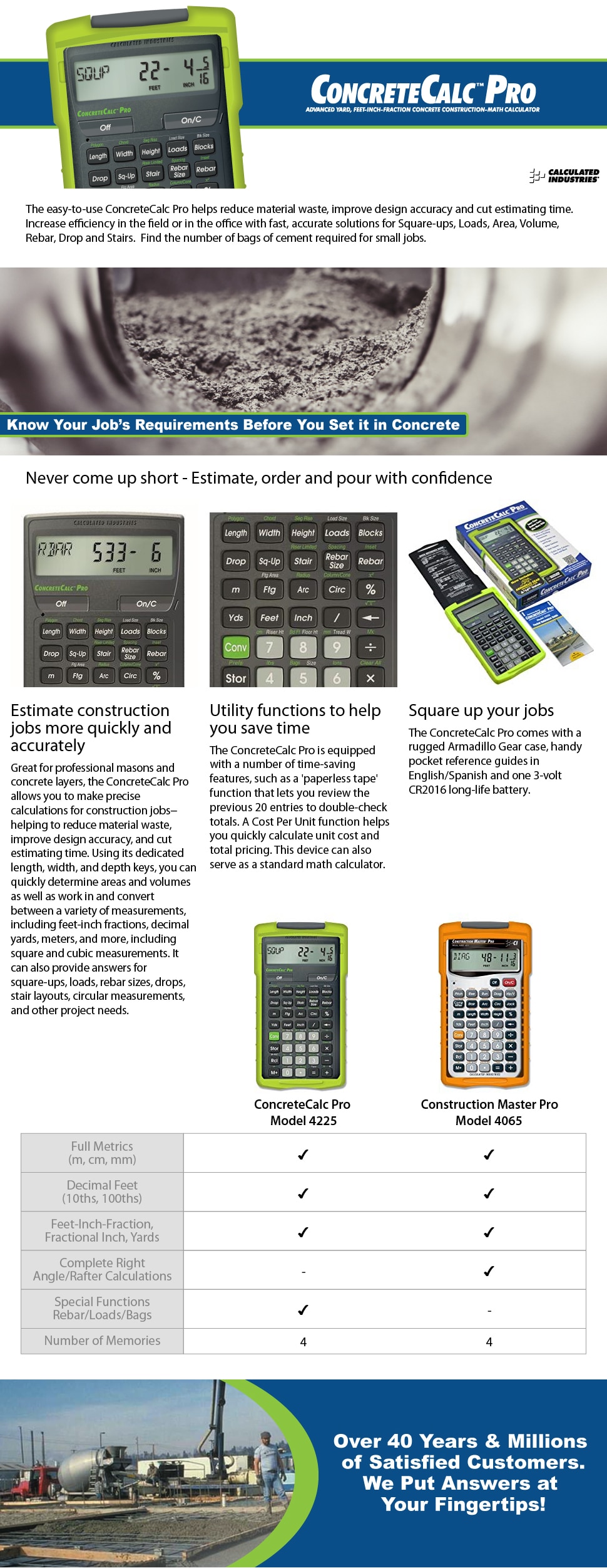 The ConcreteCalc Pro is designed for concrete and paving pros. Yard, feet-inch-fraction and metric calculator helps reduce material waste, improve design accuracy and cut estimating time for all kinds of concrete jobs. Fast, accurate solutions for square-ups, loads, area, volume, drop and stairs. Rebar function finds total length, weight per size and inset. You can even calculate the number of loads for big jobs and the number of bags needed for small jobs. The easy-to-use ConcreteCalc Pro helps reduce material waste, improve design accuracy and cut estimating time.