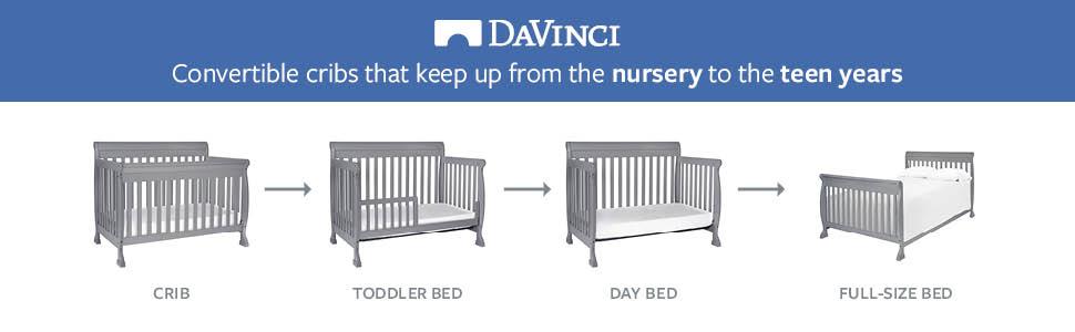 Converts to toddler bed, daybed and full-size bed (conversion kits sold separately) and front-rail measurements (top to floor)- 35 inch height
