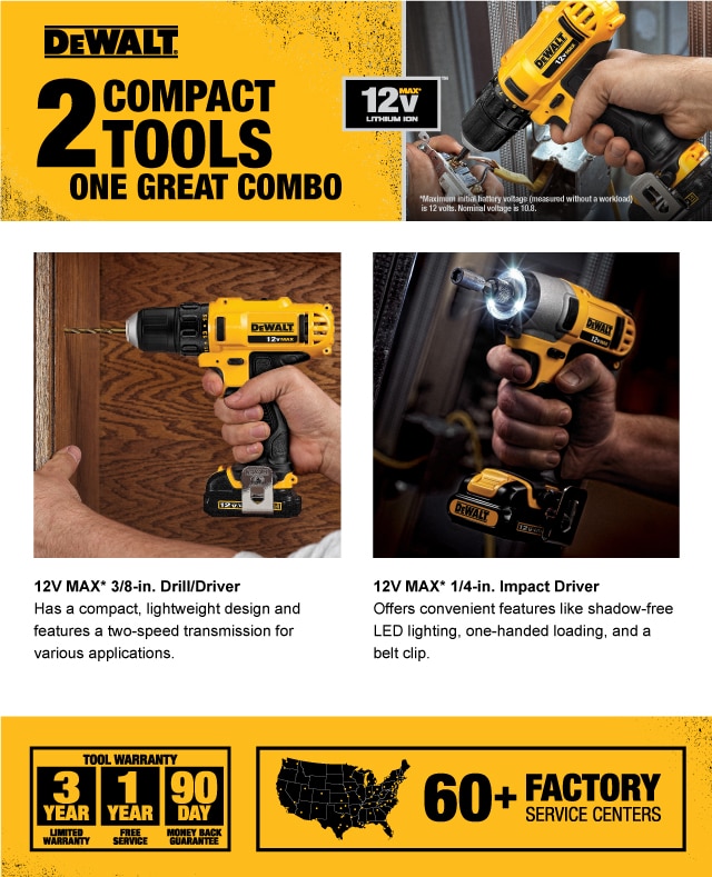 The dewalt max 12V lithium-ion 2-tool combo kit includes a lightweight and compact 3/8 in. Drill/driver and a 1/4 in. Impact driver. The drill/driver features a 3/8 in. Single-sleeve keyless chuck and a versatile dual-speed transmission. The impact driver offers 3400 impacts per minute and up to 79 ft. Lbs. Of torque.