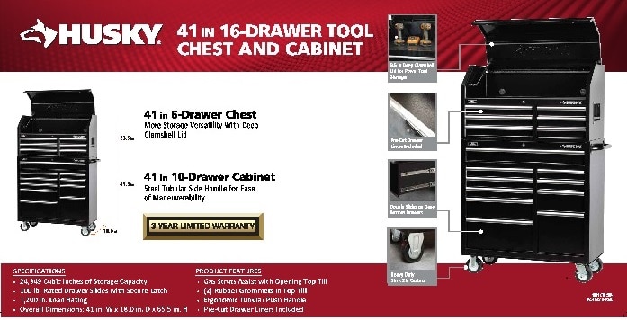 Keep your garage clutter-free with the Husky 41 in. 16-Drawer Tool Chest and Cabinet Set in Black. Ideal for heavy use, it is built with an all-welded 21-Gauge steel construction to offer you a strong and sturdy finish. This Husky professional tool chest has an industrial powder coat paint finish with rust-resistant properties, which increases durability and protects the unit against weathering. It is designed with a lid that features gas struts for extra safety when opening and closing. It is made with 16 drawers - seven small, eight medium and one large and features a total holding capacity of 24,954 cu. in., providing plenty of storage space for all your equipment. Excellent for effortless opening and closing, this Husky high-quality tool chest is designed with ball bearing slides that can hold up to 100 lbs. to accommodate heavy loads. Designed to offer you peace of mind, it features an internal locking system with two keys, making it ideal for storing expensive tools. This Husky tool cabinet has swivel casters that support up to 1,200 lbs. and an ergonomic tubular handle, designed for easily moving the unit. Upgrade your tool storage with the Husky 41 in. 16-Drawer Tool Chest and Cabinet Set in Black.
