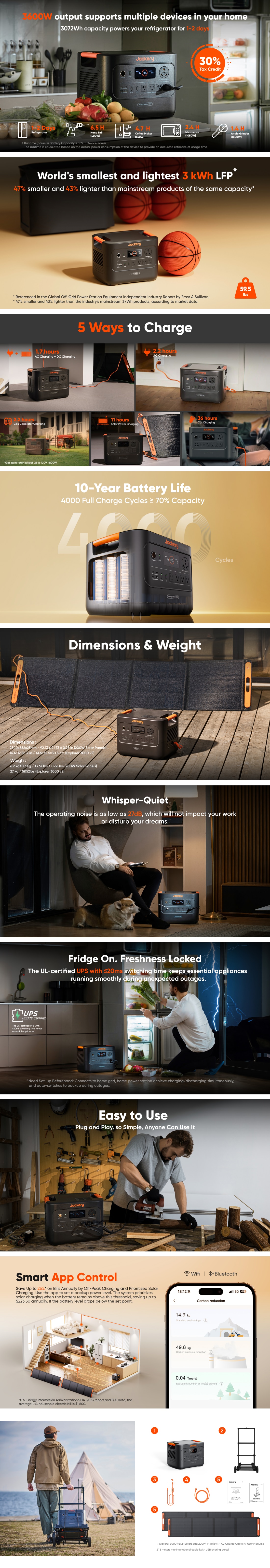 Jackery Explorer 3000 v2 delivers 3,072Wh capacity with 3,600W output (7,200W surge), ideal for camping, off-grid living, and home backup. This portable solar generator kit supports multiple charging methods, including AC, car, and solar, with 200W bifacial panels for efficient solar input. Built-in ‚â§20ms UPS ensures seamless backup during outages, while ChargeShield 2.0 provides fast, safe charging with top-tier safety certifications. Smart app control via Bluetooth and Wi-Fi allows easy energy management, and seven layers of protection-including waterproof, dustproof, and fireproof-ensure durability in any environment. Includes a foldable aluminum trolley supporting up to 176 lb, with lockable swivel wheels and quick-fold design for easy transport across various terrains, enhancing portability and convenience.