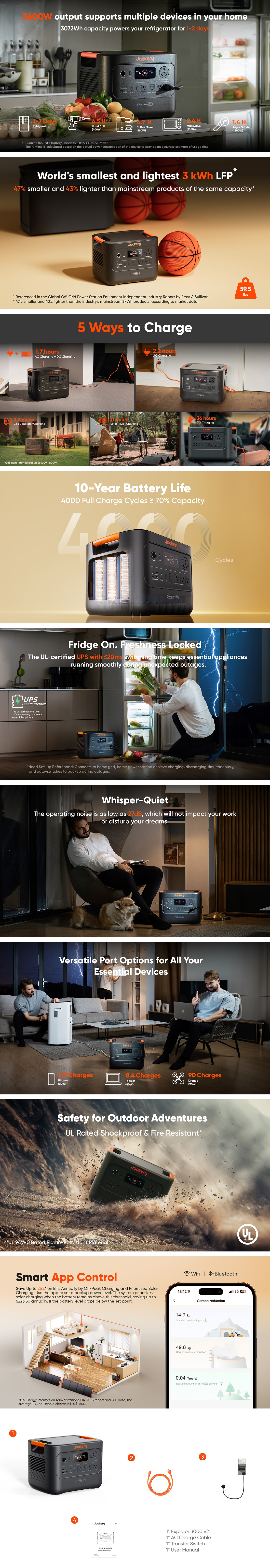 Jackery Explorer 3000 v2 delivers an impressive 3,072Wh capacity and 3600W power output (7200W surge) in an ultra-compact 59.52 lb design. Paired with the transfer switch, it enables direct connection to your home's essential circuits, ensuring safe and convenient whole-home or partial-home backup power during outages. It supports versatile charging options, including AC, solar, car, and hybrid charging, while the advanced ChargeShield 2.0 ensures faster, safer recharging. With a ‚â§20ms ultra-fast UPS, it provides seamless backup power, and its ultra-low self-discharge rate allows for up to one year of storage on a full charge. Featuring smart app control via Bluetooth and Wi-Fi, energy management and cost optimization are at your fingertips, making power management effortless and efficient.