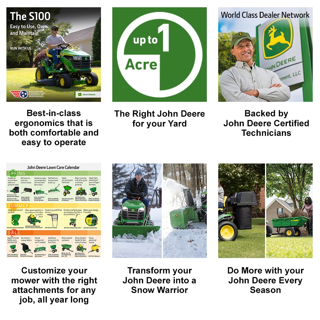 Built in Greeneville, TN USA, the John Deere S100 Riding Lawn mower is the most affordable 42 in. deck model of the 100 Series line up. The ride is comfortable, with an ergonomic design, easy-to-use, adjustable controls and a 11 in. mid-back seat. The S100 also features LED lighting, a hydrostatic transmission, and side-by-side foot pedals for easy operation. The 42 in. Edge Cutting System is time-tested, proven to offer superior cut quality and can easily be equipped to bag or mulch. The John Deere branded Briggs & Stratton single cylinder engine is 17.5 HP - plenty of power for mowing, bagging, or mulching 1-acre of land, while offering efficient fuel economy at up to 5.5 mph. All John Deere 100 Series Riding Mowers are backed by certified John Deere dealers with a 2-year/120-hour bumper-to-bumper warranty. Ensure to register for your John Deere warranty to cover your investment from QR code found on your new machine.