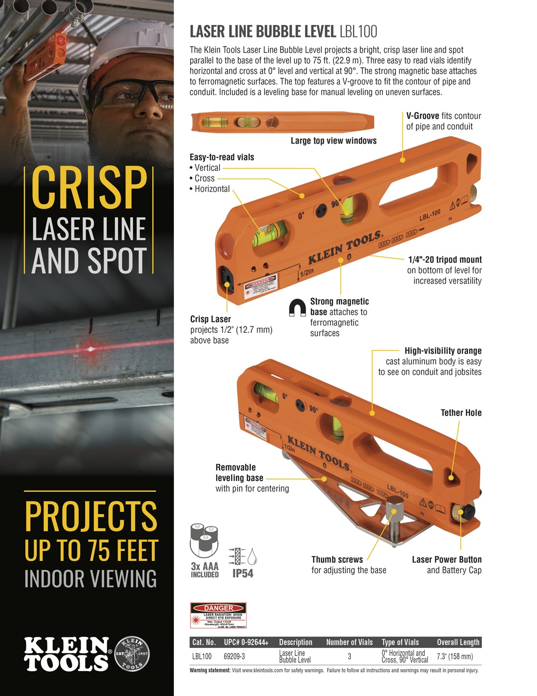 The Klein Tools Laser Line Bubble Level LBL100 projects a horizontal laser line and spot parallel to the base of the level up to 75-Foot (22.9 m). Three easy to read vials identify horizontal and cross at 0-Degree level and vertical at 90-Degree. The strong rare earth magnetic base of the level attaches to the included leveling stand and other ferromagnetic surfaces. The top features a V-groove to fit the contour of pipe and conduit. Includes a leveling stand for manual leveling on uneven surfaces.