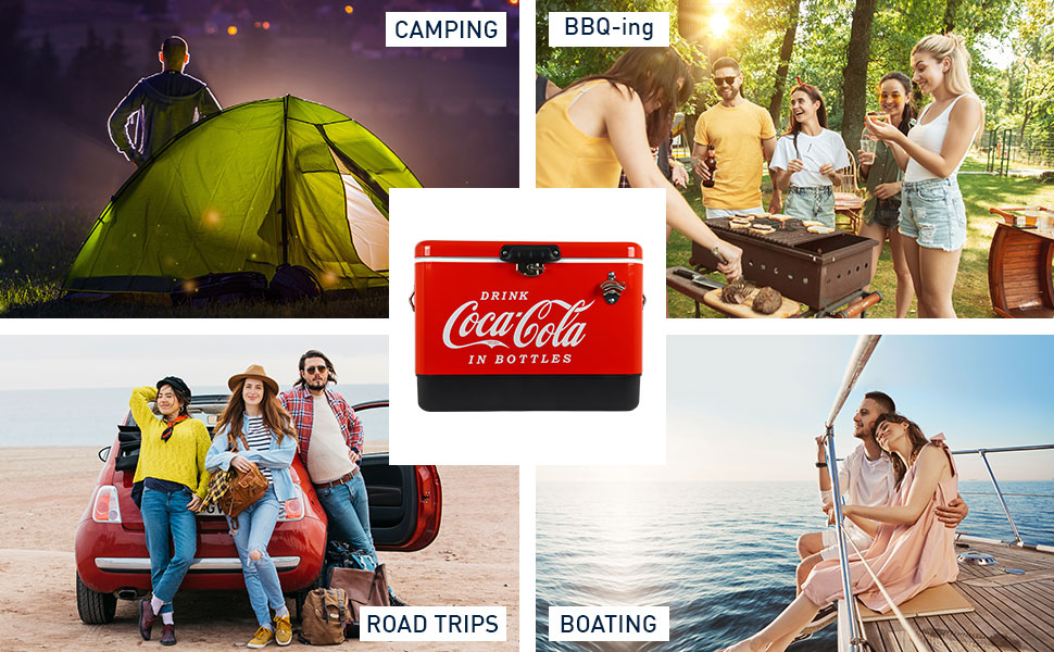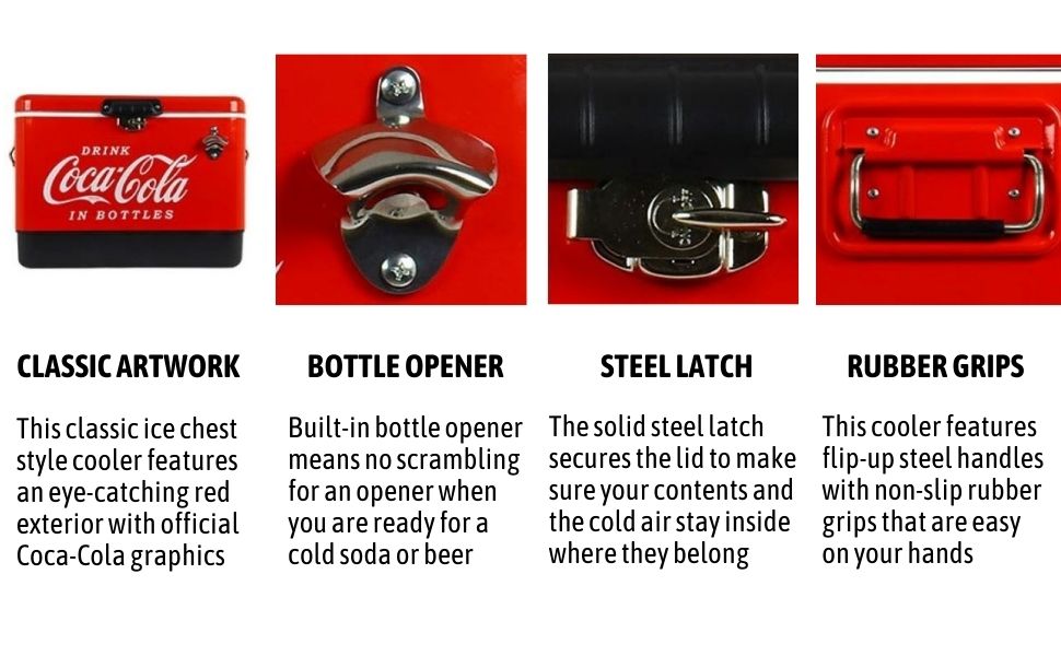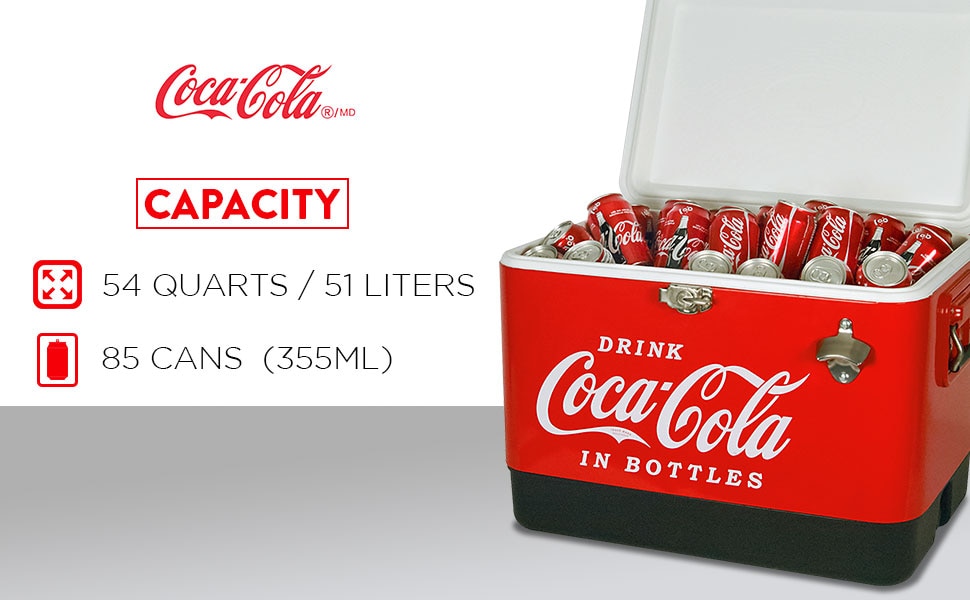 This rugged Coca-Cola themed cooler holds up to 85 standard cans! The convenient built-in bottle opener is ideal for day trips, boating, or backyard BBQs! Fill it with ice and pre-chilled drinks and snacks for maximum cooling that goes the distance!