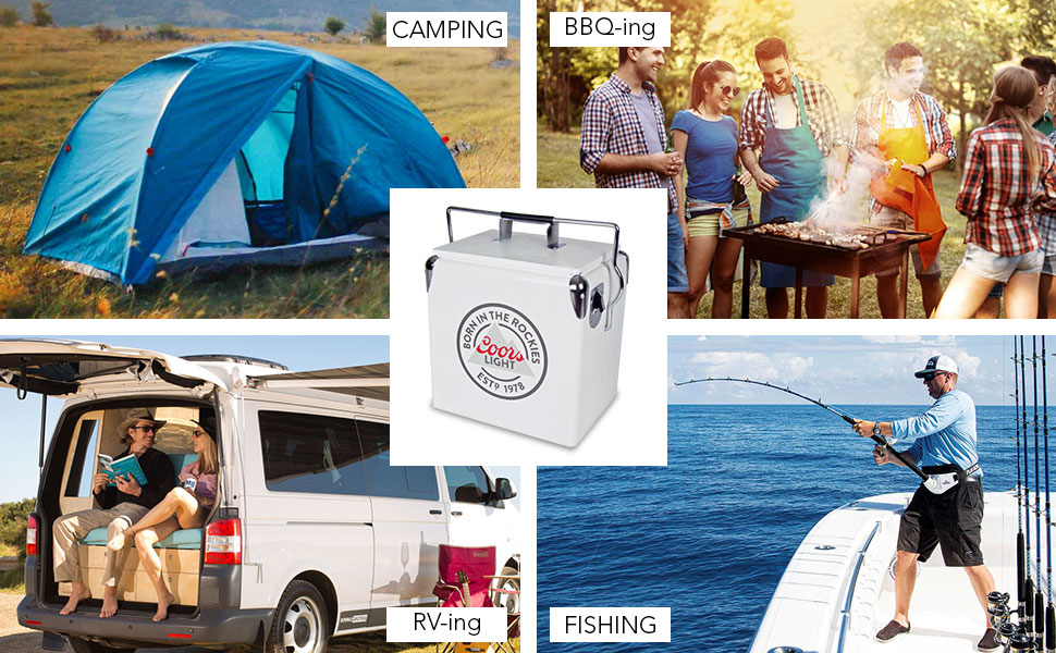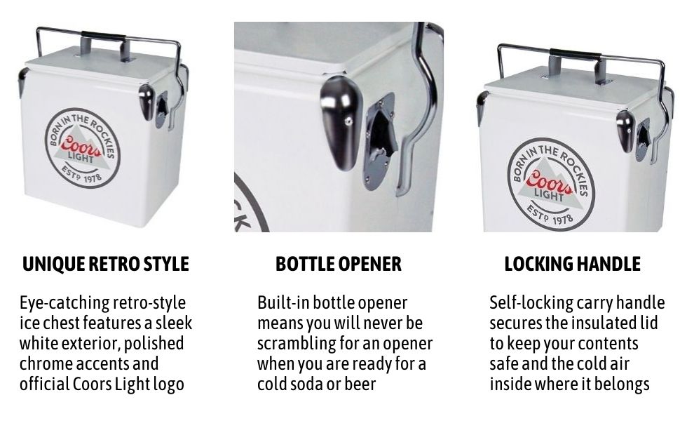 Rugged steel-belted cooler comes with convenient built-in bottle opener. It is the perfect accessory for day trips, boating, or backyard BBQ. Fill it up with ice and pre-chilled drinks and snacks for maximum cooling that goes the distance!