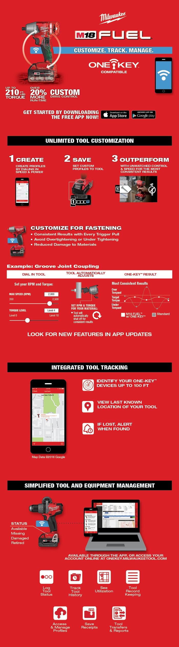 The M18 FUEL 3/8 in. Compact Impact Wrench features a POWERSTATE Brushless Motor that delivers 0-2,500 RPM and 0-210 ft-lbs of fastening torque with constant power output under heavy load. REDLINK PLUS Intelligence is the most advanced electronic system on the market, preventing damage to the tool and battery caused by overloading or overheating. REDLITHIUM Batteries deliver more work per charge and more work over the life of the pack than competitive batteries on the market. Compatible with ONE-KEY, this is the industry's first Impact Wrench that wirelessly connects to a smart phone to Customize, Track and Manage a tool's performance and location. Unlimited Tool Customization allows you to connect to the tool and access predetermined set-ups for specific fasteners and materials, or have complete control over output speed and power for the specific application at hand. Once the desired output performance is reached, the custom profile is then saved to the memory of the tool and the connection to the smart phone is no longer necessary. The tool's memory supports up to 4 custom profiles that can be easily accessed with the touch of a button on the tool. Your custom profiles are also saved in the cloud so that they can be accessed at any time. Integrated Tool Tracking, also available through ONE-KEY, provides full visibility to how and where tools are being used across your network of jobs and users.
