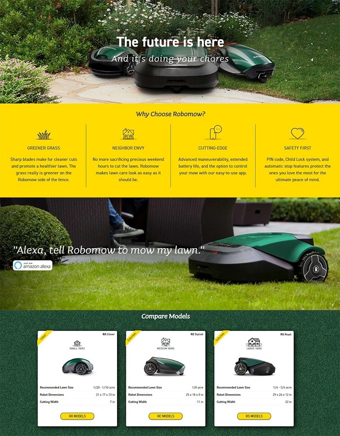 Welcome to an entirely new lawn mowing experience with the Robomow RS612. Designed to provide the most convenient and least time-consuming mow ever. Download the Robomow 2.0 app to let you connect via Bluetooth, so you can manage your mower at any time. Robomow now joins the Alexa smart home ecosystem, cutting your grass on voice command! This model is designed for larger yards up to 1/4 acre (10,890 square feet) and cuts efficiently and effectively with its dual blades and 22" cutting width. In addition, the Robomow cuts and travels on slopes up 20 degrees or a 35% grade. Fast and Easy Setup gets you mowing quickly. Just peg wire around the perimeters of the mowing area, set your weekly mowing schedule, and relax while Robomow mows for you. With the Integrated Rain Sensor, your robotic mower returns to the base station in rainy weather and starts again when conditions improve. The powerful lithium-ion high-performance batteries provide an efficient mowing speed and are long lasting to finish the job. The Unique edge mode and "cut beyond the wheel" design provides an impeccable finish on your edges, and Robomow can be easily be wired to automatically travel and mow in different zones within your yard. So Quiet, you can even allow your mower to work during quiet hours. The Robomow includes an Anti-Theft & Safety System. A valid code is required to operate and the Unit automatically shuts off if mower is tilted or picked up to protect small children and animals around the yard.