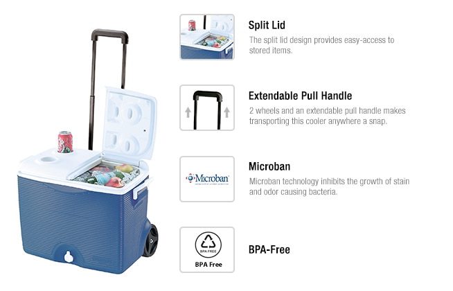 The 45 Qt. Wheeled Cooler has rugged, all-terrain wheels for easy maneuverability. A hinged, split lid creates easy access to the contents without letting all the cold air out. Superior thermal retention keeps food and beverages cold, while the built-in cup holders fit 12 oz. cans and 20 oz. bottles.