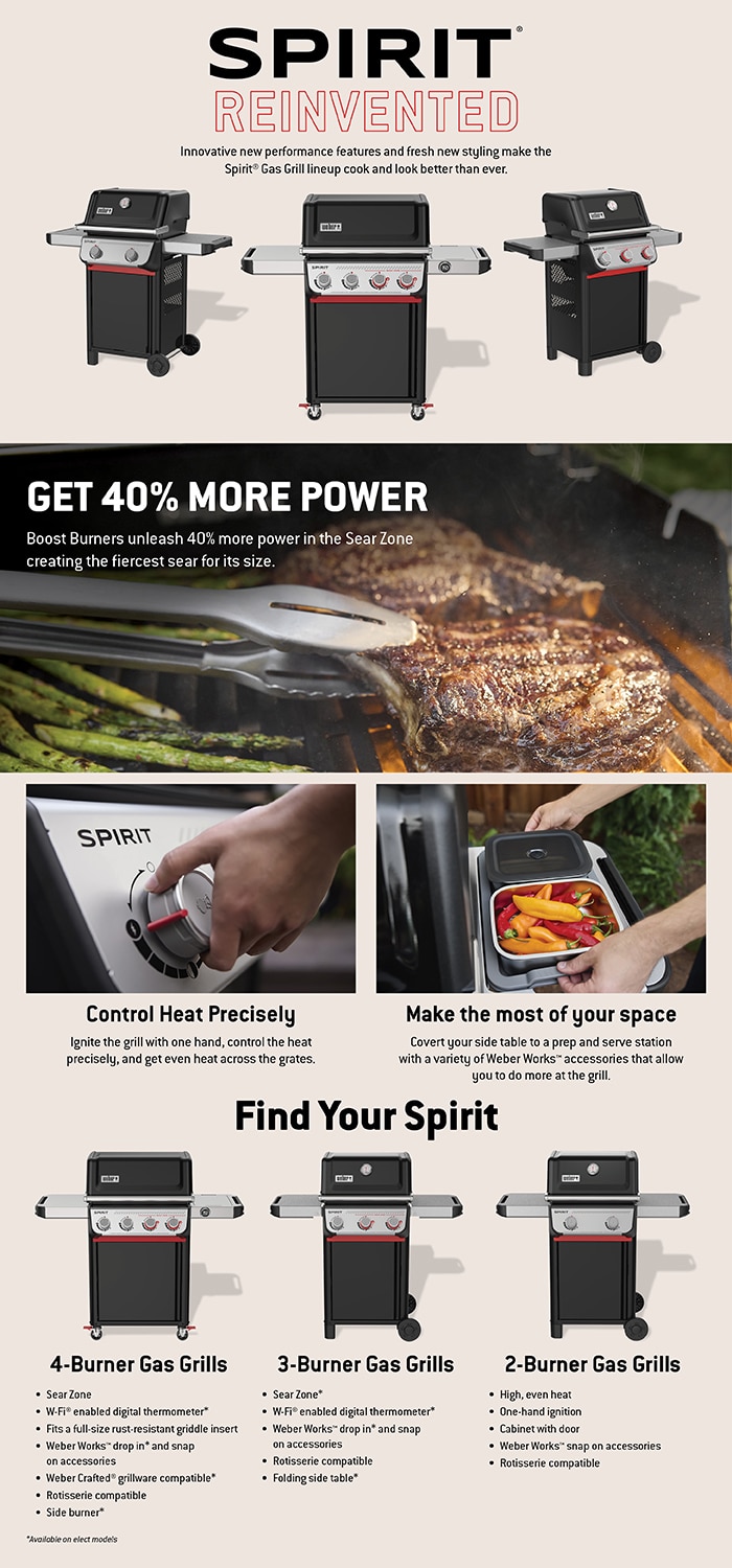 Grill food that tastes better than ever on the reinvented 3-burner Spirit EP-325 Gas Grill with Sear Zone. Create bold, flavorful sear marks on meat, fish, and vegetables with 2-red Boost Burner knobs that unleash 40% more power in the Sear Zone. Ignite each individual burner easily with one hand with Snap-Jet Ignition and control the heat precisely with a full range of temperatures from high to low and everything in between. See the cooking temperature at a glance with a digital thermometer that's easy-to-read day and night. Make the most of your space by adding a variety of Weber Works drop-in accessories (sold separately) to the side table and snap-on accessories (sold separately) to the side rails.