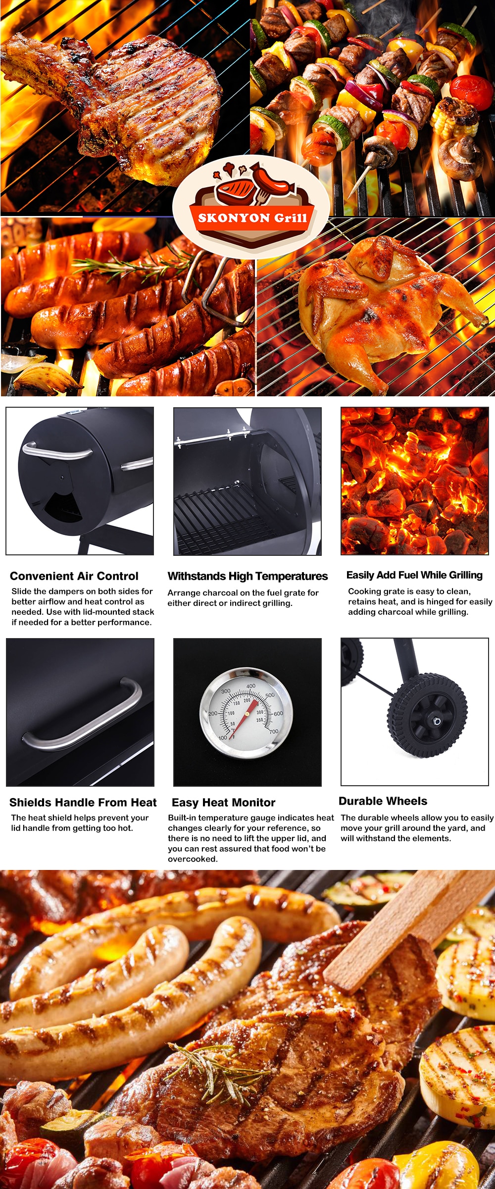 BBQ is closely tied to our social reunion during-weekends and holidays. Grilling party at the backyard comes as a welcome relief from the hustle and bustle of city life. The laugh and happiness witness our grand success. We cherish every chance to brighten up each lovely face with SKONYON. As we all know, smoking meats involves a lot of time and patience and it is not as simple as placing a slab of meat on the grill. So, it is of the utmost importance to select a versatile charcoal smoker to meet your demand. SKONYON Charcoal Grill with Offset Smoker can solve all the difficulties for each smoking aficionado. Spacious grilling space as you need and only small amount of effort that you will put into are decided advantages, first and foremost, it meets your budget. Choose this grill that best suits you and your family, it will impart a satisfying grilling and smoking taste to your buds.