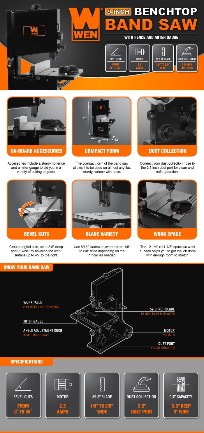 Remember when you had a saw that was both compact and powerful. The WEN 9 in. Benchtop Band Saw attacks boards with cuts up to 3-1/2 in. D and 9 in. W. The 2.8 Amp motor rotates the included 1/4 in. blade at up to 2500 ft. per minute. The design of this saw uses 59-1/2 in. blades anywhere from 1/8 in. to 3/8 in. in width for both intricate and powerful cuts. The spacious work table measures in at 12-1/4 x 11-7/8 in. in size and can be beveled up to 45°. This package includes a miter gauge, an onboard 2-1/2 in. dust port, a fence for creating straight cuts and an adjustable blade guard with ball-bearing supports. Ball-bearings give the blade smooth operation and a long-lasting life for years of dependable service. And because it's a WEN product, your WEN 9 in. Benchtop Band Saw comes backed by a two-year warranty, a stocked inventory of replacement parts and a friendly customer phone line all to make sure you remember WEN.