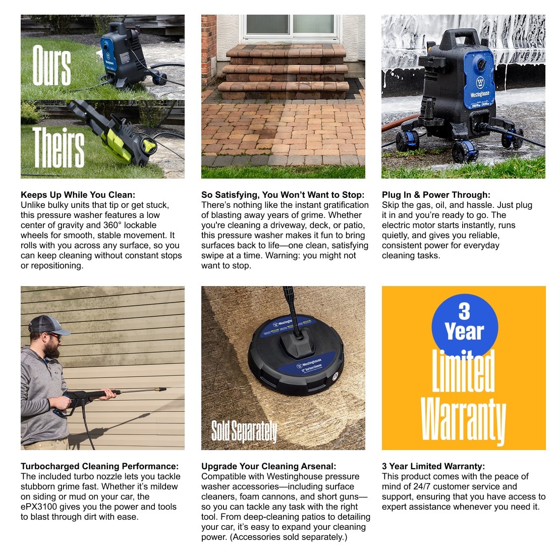 Tackle the toughest grime with the Westinghouse ePX3100 electric pressure washer which is designed for your most easy and convenient cleaning experience yet. It delivers 2300 max PSI and 1.76 max GPM (at lowest pressure), and 1900 rated PSI and 1.24 rated GPM of water flow. This electric pressure washer has the muscle to scrub away mildew, grease, oil, tar, mud, rust and more from all household surfaces with pure scouring force. Engineered to be perfectly balanced with a low center of gravity at 16.5" tall, it utilizes anti-tipping technology with four-wheel steering to dramatically increase comfort of use and maneuverability. With 360° turns, it'll follow you wherever you go in one smooth motion from driveway to grass and maximize the efficiency of your cleaning tasks. Constructed into a super compact package, tuck it away and pull it out of storage with ease. This electric pressure washer features a pro-style gun with five quick connect spray tips, onboard detergent tank and a flexible 25' easy-coil hose for versatility at your fingertips. Backed by a Total Stop System (TSS) to conserve energy and prolong pump life, the ePX3100 electric pressure washer will keep you blasting away dirt with half the size and all the power.