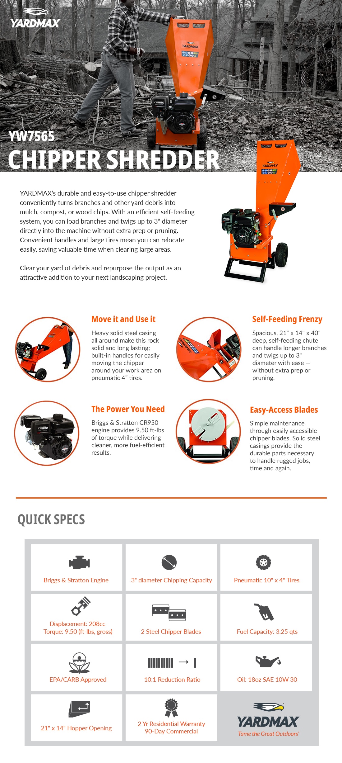 YARDMAXs durable and easy-to-use chippers conveniently turn branches and other yard debris into mulch, compost or wood chips. With an efficient self-feeding system, branches and twigs up to 3 in. Dia can be loaded directly in the machine without extra prep or pruning. Extremely maneuverable, these chipper shredders can be easily moved around to save valuable time when clearing a space. Not only can you clean your yard of debris, but save money and the planet repurposing the output as an attractive addition to your next landscaping project. Delivering enhanced design options as standard, you cant go wrong with a wood shredder from YARDMAX.