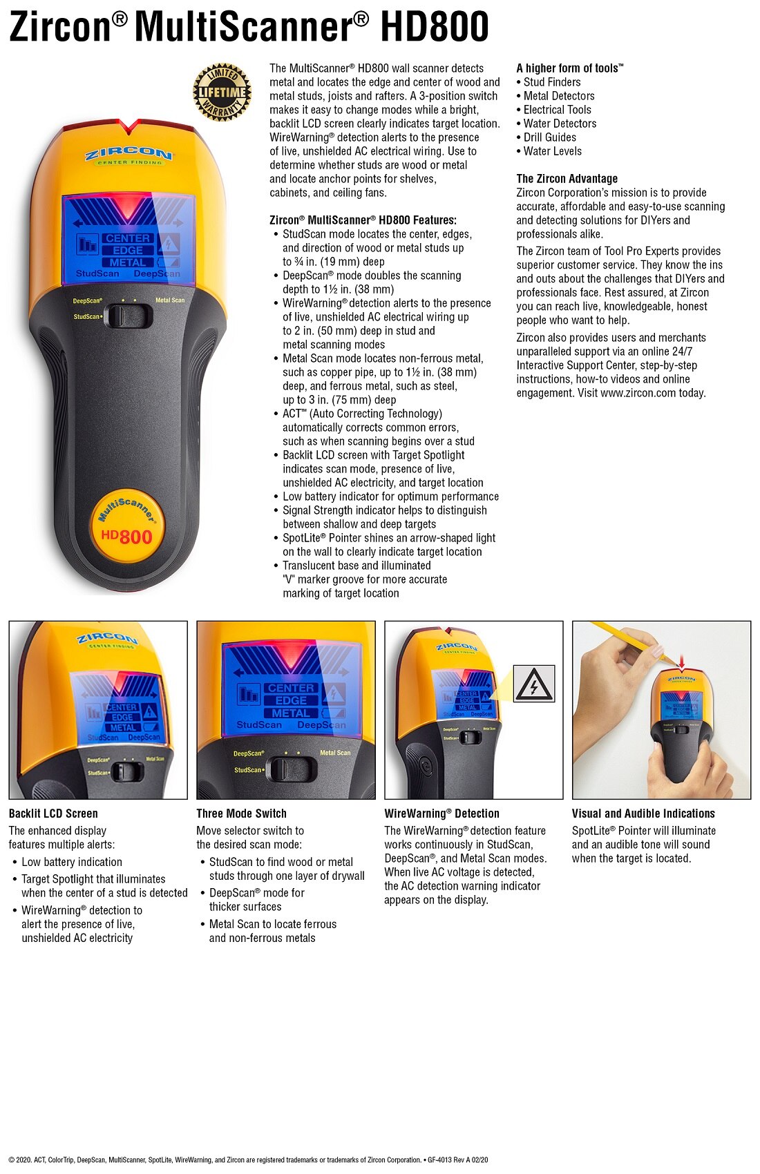 MultiScanner HD800 1 Step multi-function stud finder locates the center and edges of wood and metal studs and joists behind walls, floors, and ceilings. It also locates metal targets up to 3 in. (76 mm) D. A 3-mode switch makes it easy to change functions, while the backlit display screen, SpotLite Pointer, and audio tone all indicate the location of the target. The signal strength indicator helps to distinguish between shallow and deep targets.